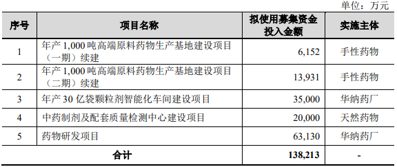 华纳药厂本次计划公开发行新股数量不超过2,350万股,拟募集资金13.82亿元,将用于投资年产1,000吨高端原料药物生产基地建设项目(一期)续建、年产1,000吨高端原料药物生产基地建设项目(二期)续建、年产30亿袋颗粒剂智能化车间建设项目、中药制剂及配套质量检测中心建设项目以及药物研发项目。具体情况如下: