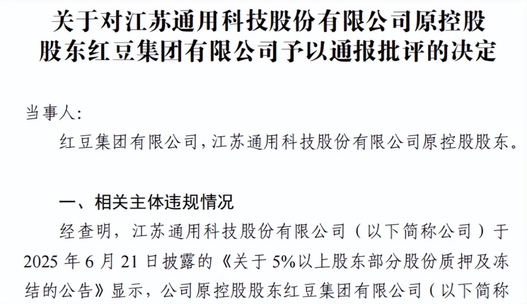 上海证券交易所对红豆集团的纪律处分,主要源于其作为江苏通用科技股份有限公司原控股股东期间的信息披露违规行为。根据上交所披露的纪律处分决定书,2024年8月至2025年5月期间,红豆集团多次将持有的通用股份股份进行质押,涉及股份数量合计占通用股份总股本的9.23%,但未及时披露上述股份质押情况。