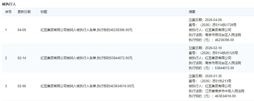 江苏省南京市中级人民法院2026年1月30日立案的(2026)苏01执213号案件,红豆集团被执行金额4.64亿元;江苏省南京市雨花台区人民法院2026年2月10日立案的(2026)苏0114执恢125号,红豆集团被执行金额5384.41万元;江苏省南京市雨花台区人民法院2026年4月8日立案的(2026)苏0114执1728号,红豆集团被执行金额4623.84万元。