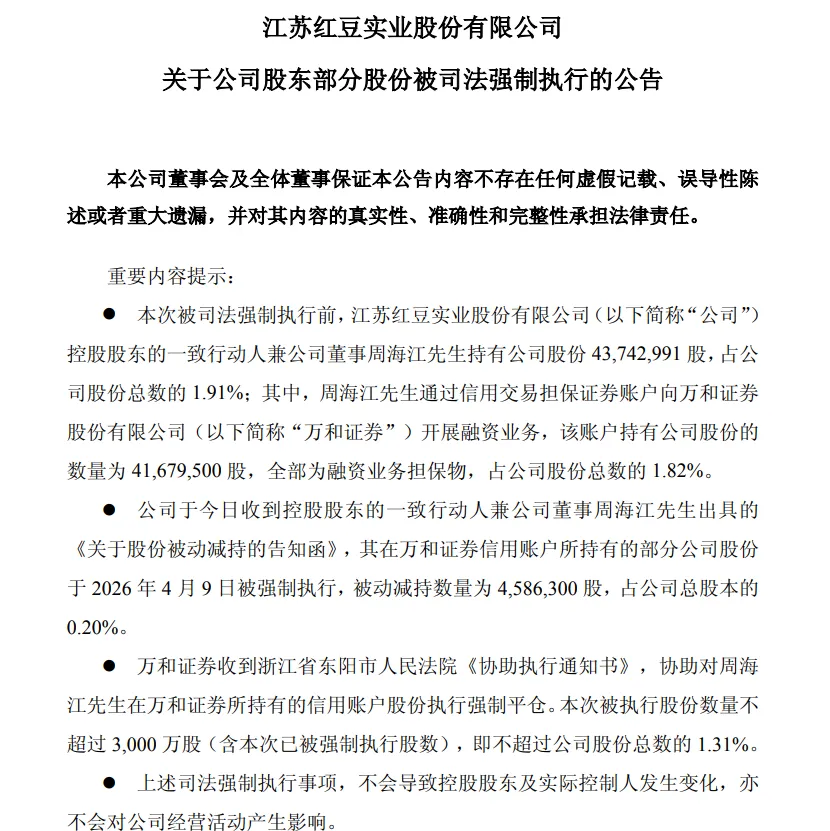 就在4月10日,红豆股份发布公告称,该公司控股股东红豆集团的一致行动人,也是控股股东的实控人周海江名下用于融资担保的红豆股份股权,已有458.6万股被司法强制执行。