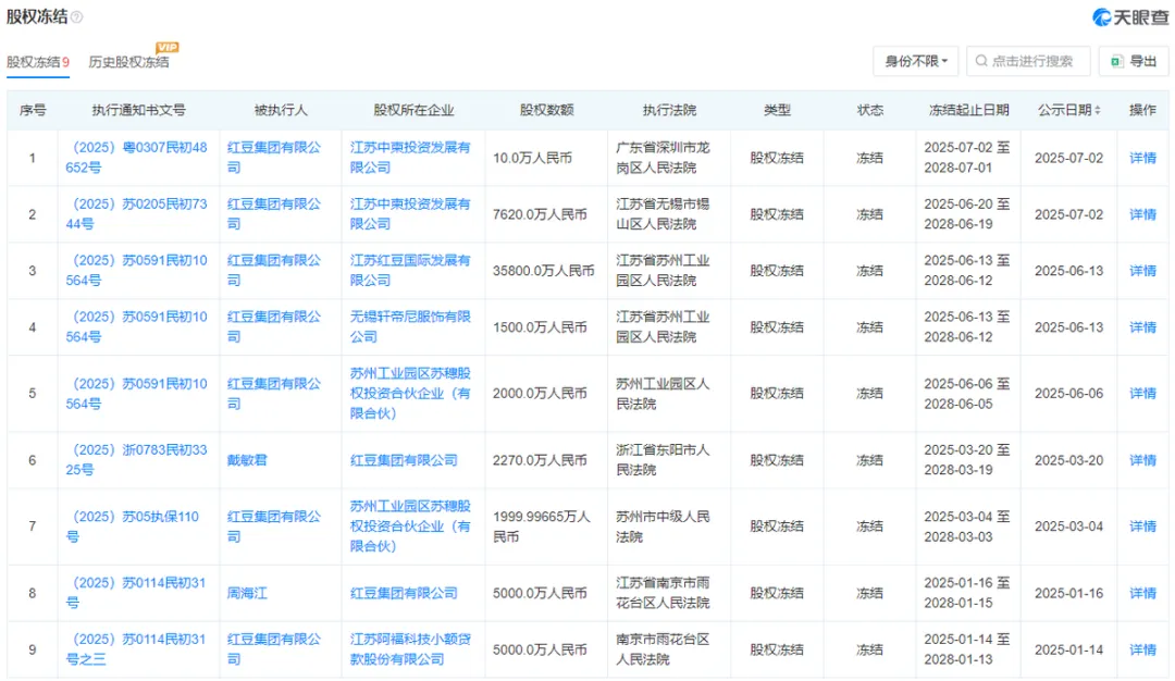 股权被冻结,对于红豆集团来说,似乎也已经成为常态。天眼查显示,2025年1月14日到7月2日,红豆集团一共有9条股权冻结信息,股权冻结数额从10万元到3.58亿元不等。