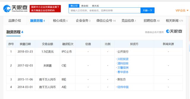 据天眼查上的融资信息显示,2018年3月份,尚德机构在美股IPO上市,其首轮募资金额达1.5亿美元。截至发稿前,尚德机构总市值为3.32亿美元。