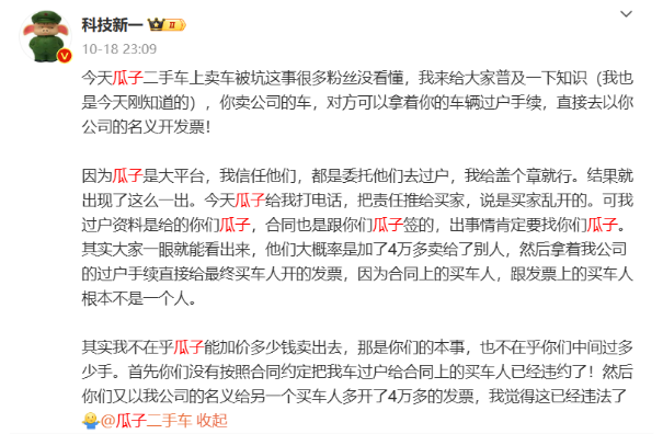 因此,这名博主质疑瓜子二手车未按照合同约定,将车过户给合同买车人,并认为该等行为涉嫌违约;而平台通过加价4万元将车进行倒卖,并拿着卖车人公司的过户手续私自给最终买车人开发票的行为,则涉嫌违法。