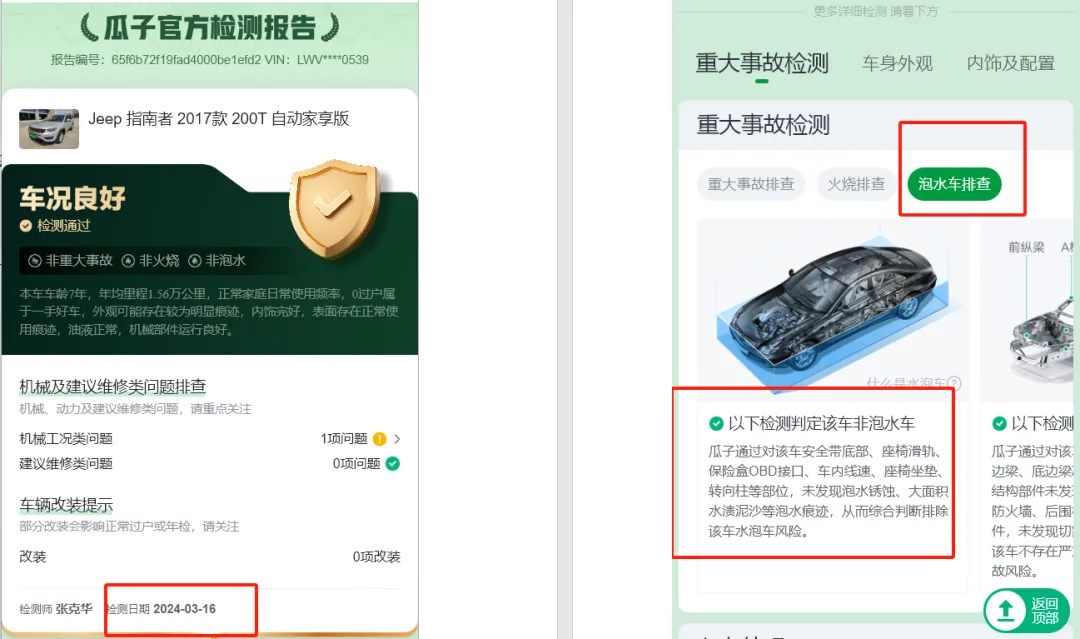 无独有偶,一位来自武汉的余姓车主向九派新闻反映称,其于今年4月末在瓜子二手车平台购买了一辆二手Jeep指南者,购入价格为5.03万元,且购买时他特别留意了此车的检测报告和车况价格,确认正常后才进行的付款。