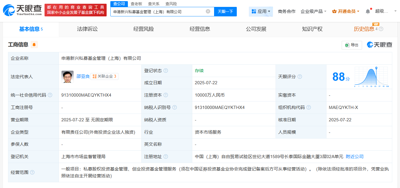 天眼查App显示,近日,申港新兴私募基金管理(上海)有限公司成立,法定代表人为邵亚良,注册资本1亿人民币,经营范围包括私募股权投资基金管理、创业投资基金管理服务,由申港证券股份有限公司全资持股。