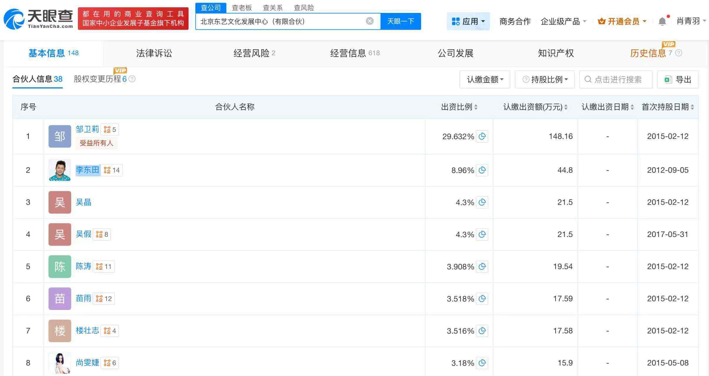 天眼查App显示,近日,北京东艺文化发展中心(有限合伙)因未依照规定的期限公示年度报告,被北京市朝阳区市场监督管理局列入经营异常名录。