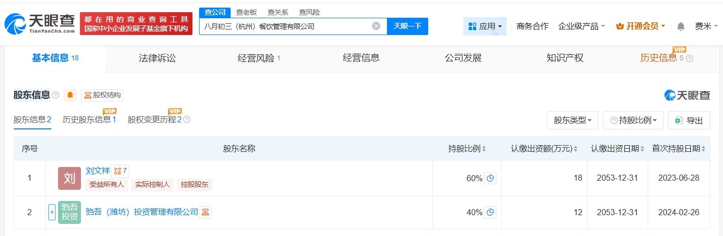 八月初三(杭州)餐饮管理有限公司成立于2023年6月,法定代表人为刘文祥,注册资本30万人民币,经营范围包括餐饮管理、酒店管理、品牌管理等。股东信息显示,该公司由刘文祥、驺吾(潍坊)投资管理有限公司共同持股。值得一提的是,今年1月,刘文祥(青岛)品牌管理有限公司已注销。