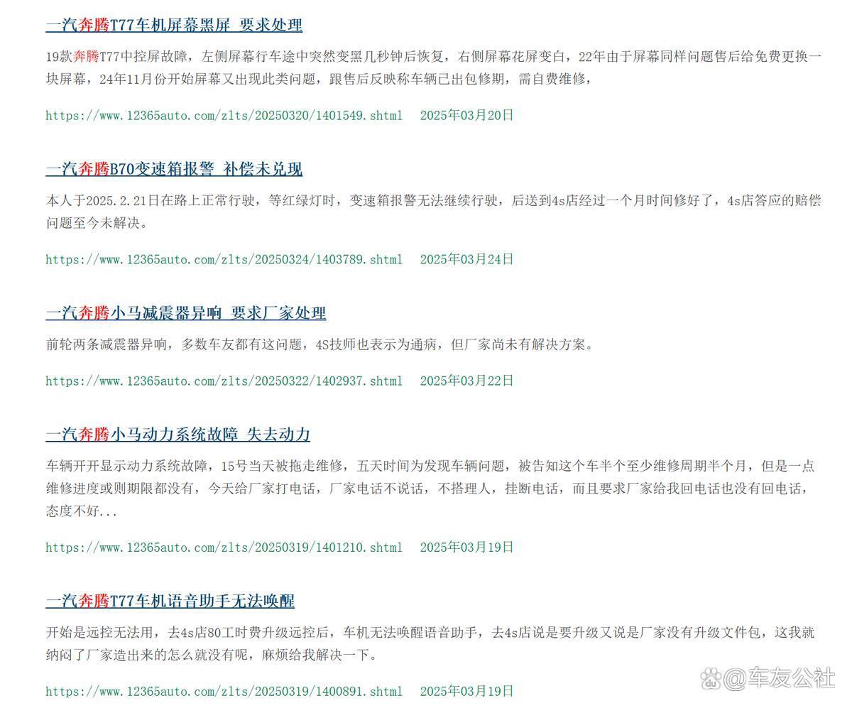 而在网络平台,也充斥着关于一汽奔腾各车型的投诉。