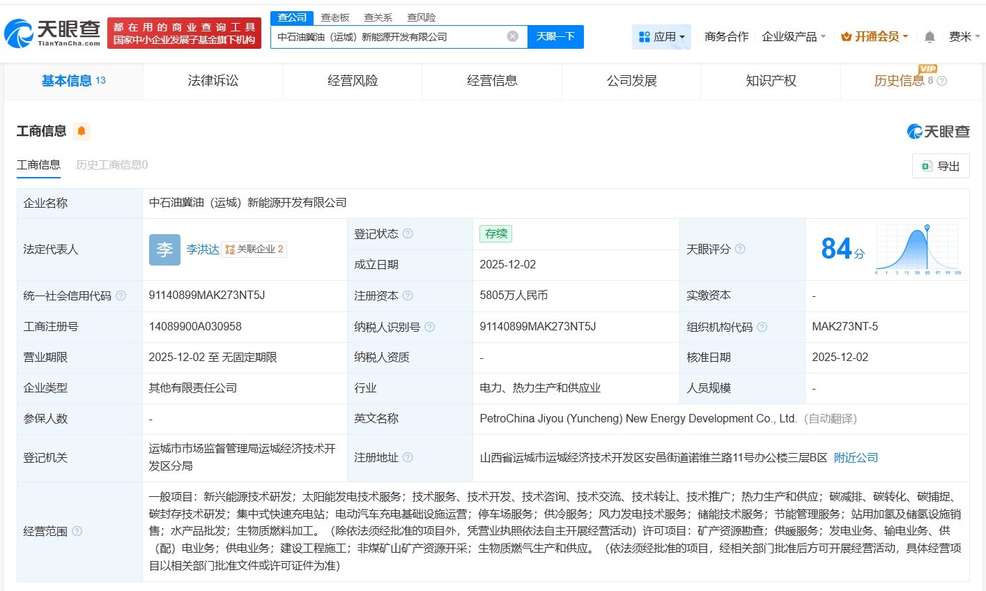 天眼查App显示,近日,中石油冀油(运城)新能源开发有限公司成立,法定代表人为李洪达,注册资本5805万人民币,经营范围包括新兴能源技术研发、太阳能发电技术服务、热力生产和供应等,由中石油太湖(北京)投资有限公司、运城市热力有限公司共同持股。