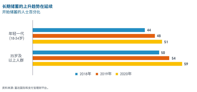 报告显示,中国居民的养老意识已连续三年持续提高。在年轻一代(18-34岁)中,有51%的受访者说他们今年已经开始储蓄,这一比例高于2019年的48%和2018年的44%。近70%的年轻人表示,正是市场的大幅波动促使他们增加储蓄,以备不时之需。约40%的年轻人表示,举国上下共克时艰也促使他们仔细规划用于养老的长期投资。