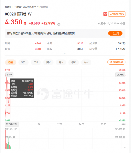 商汤科技正式登陆港交所 涨幅曾一度超20%快讯