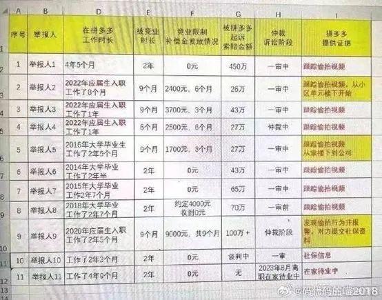 与该协议同时流出的还有一份“举报人表格”,表格显示,举报人1在拼多多工作时长4年5个月,被竞业时长两年,被拼多多起诉赔偿450万元;工作时长最短的举报人2工作时长为8个月,被拼多多起诉赔偿26万元。令人费解的是,举报表格中显示拼多多提供的证据主要为“跟踪偷拍视频”。对于竞业协议和举报人表格的真实性,记者已致函拼多多相关负责人及官方客服,截至目前尚未获得回复。