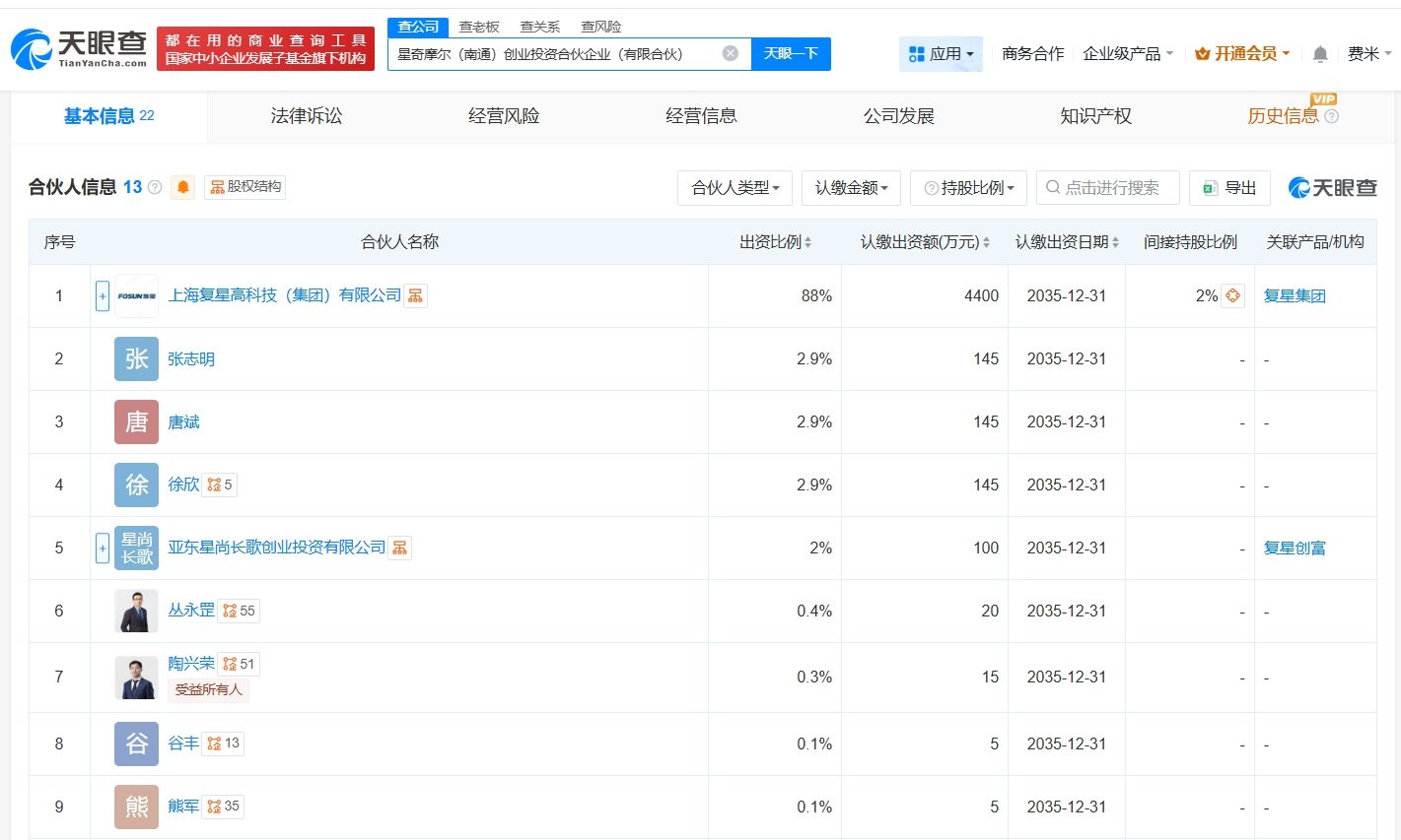 天眼查App显示,近日,星奇摩尔(南通)创业投资合伙企业(有限合伙)成立,执行事务合伙人为亚东星尚长歌创业投资有限公司,出资额5000万人民币,经营范围为创业投资。合伙人信息显示,该合伙企业由上海复星高科技(集团)有限公司、亚东星尚长歌创业投资有限公司、张志明等共同出资。
