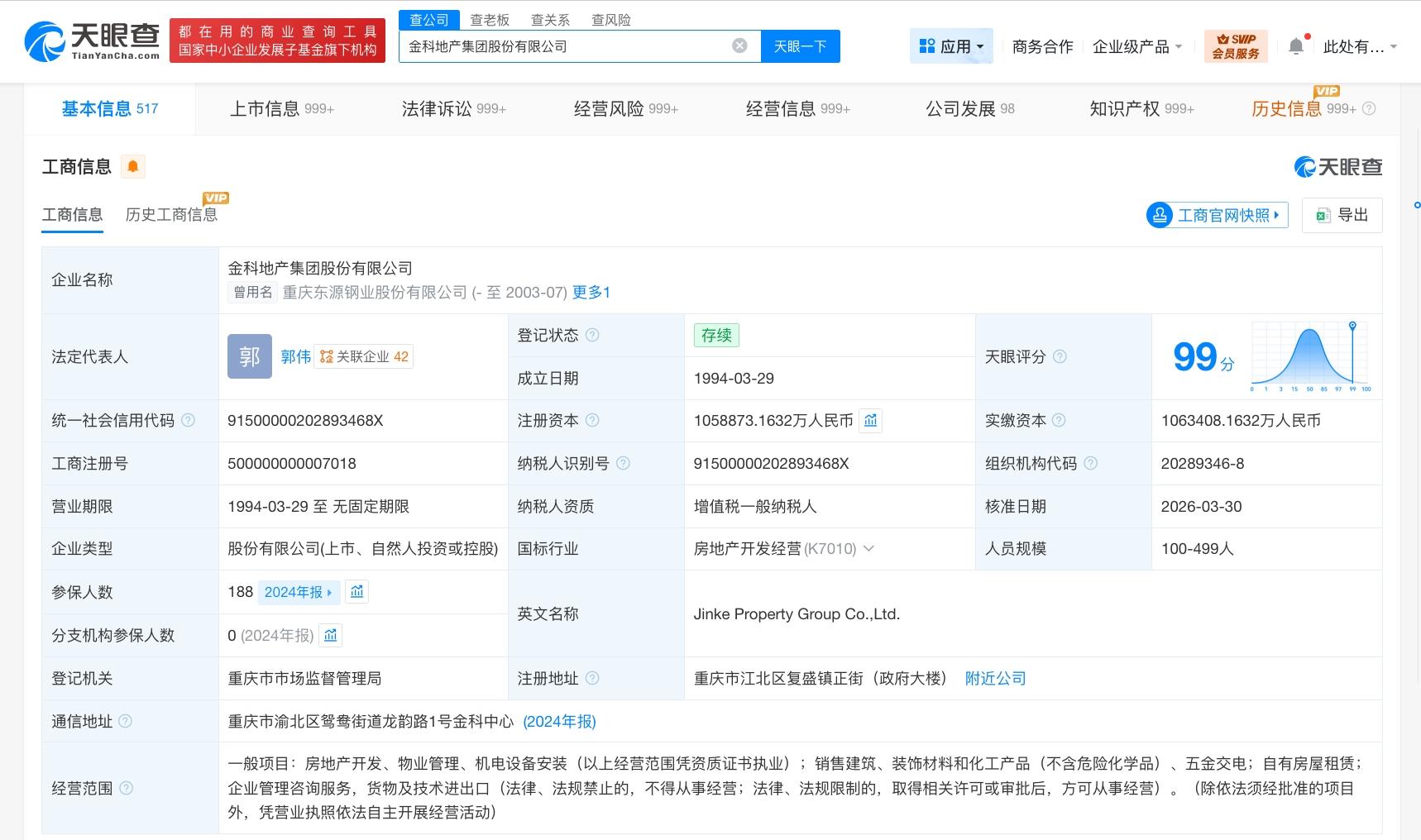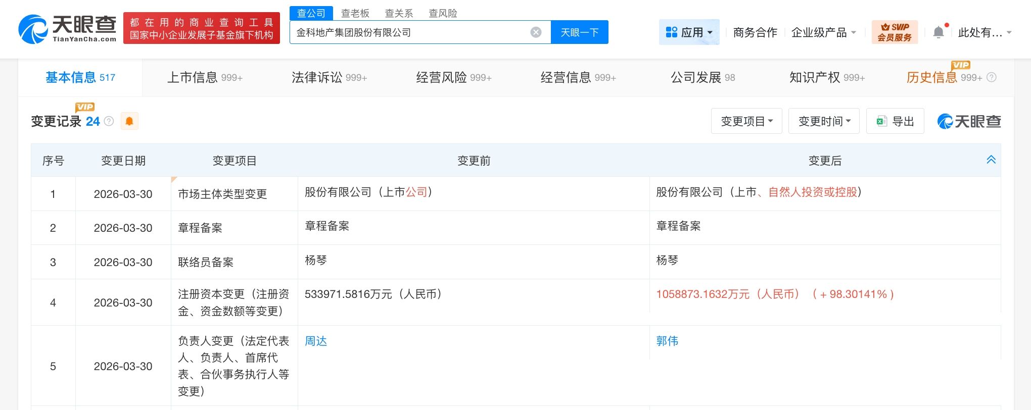 天眼查工商信息显示,近日,金科地产集团股份有限公司发生工商变更,注册资本由约53.4亿人民币增至约105.9亿人民币,增幅约98%。同时,周达卸任法定代表人,由郭伟接任。