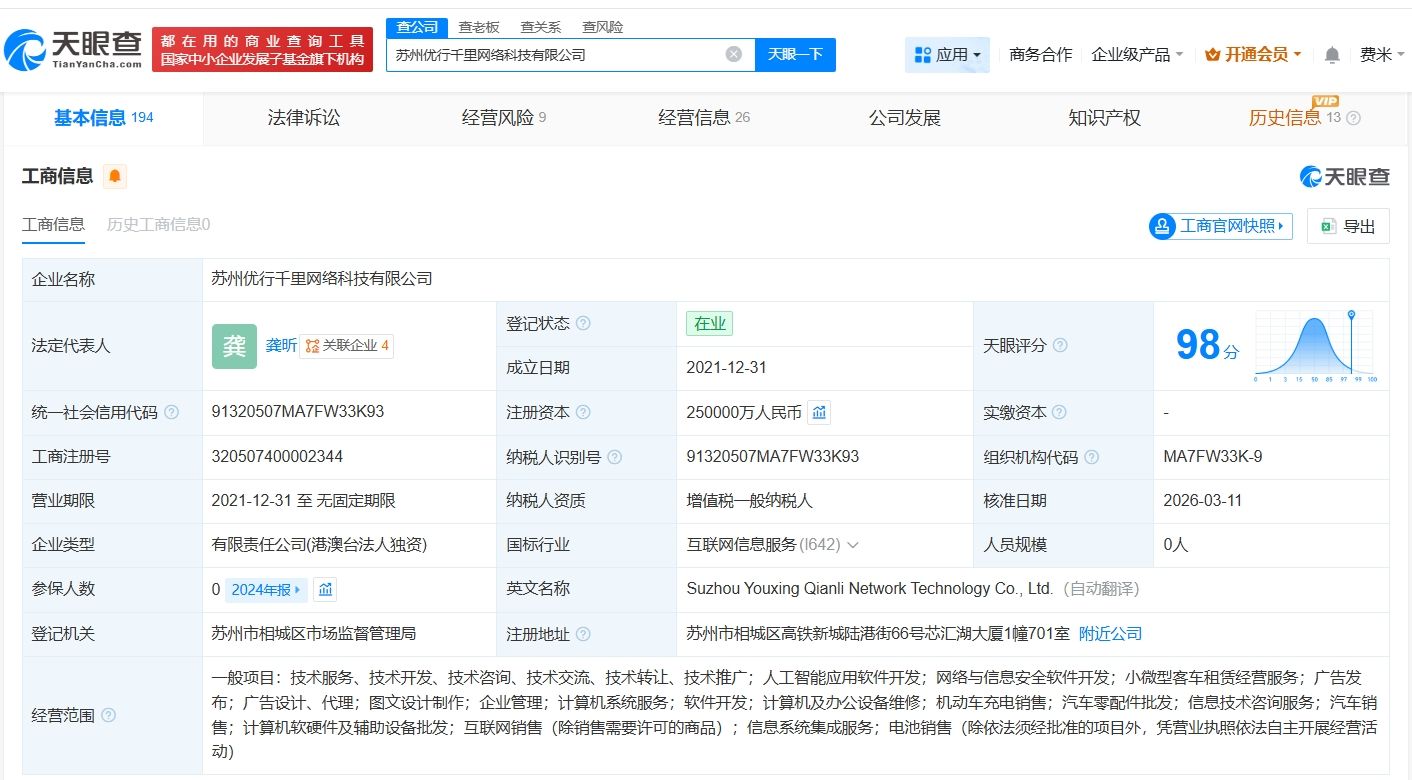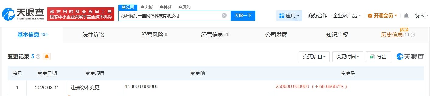 天眼查工商信息显示,近日,苏州优行千里网络科技有限公司发生工商变更,注册资本由15亿人民币增至25亿人民币,增幅约67%。