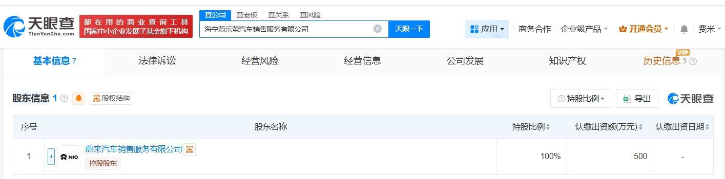 天眼查App显示,近日,海宁蔚乐萤汽车销售服务有限公司成立,法定代表人为庞梁,注册资本500万,经营范围包括新能源汽车整车销售、机械设备销售、五金产品零售等,由蔚来汽车销售服务有限公司全资持股。