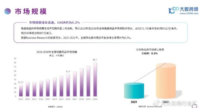 大数跨境发布的《2024成人市场洞察报告》显示,成人市场规模正在极速增长,预计2019年-2026年,全球市场规模将从271.7亿美元增长至527亿美元,2030年更是有望达到807亿美元,折合人民币超5800亿元。
