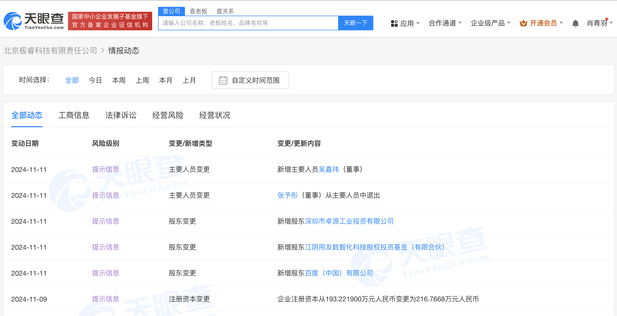 天眼查App显示,近日,北京极睿科技有限责任公司发生工商变更,新增百度(中国)有限公司、深圳市卓源工业投资有限公司、江阴用友数智化科技股权投资基金(有限合伙)为股东,注册资本由约193.22万人民币增至约216.77万人民币。