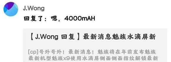 黄章:魅族Note 9配备4000mAh电池快报