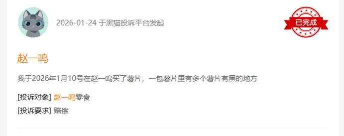 黑猫投诉平台中,“赵一鸣”的相关投诉有2096条,而“零食很忙”的投诉则有954条。相关的投诉主要集中在食品发霉变质、吃的时候发现异物、称重不准、临近保质期的产品混在一起卖等方面,其中有关食品安全的投诉占了一半以上。