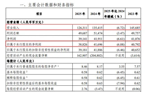 再说到光大银行,其经营业绩正面临着下滑的压力。年报数据显示,2025年该行实现营业收入1263.11亿元,同比下降6.72%;实现净利润391.41亿元,同比下降6.61%。