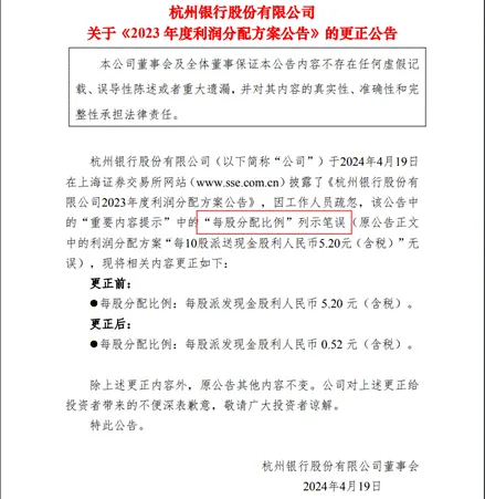 两年前,杭州银行在2023年度利润分配方案公告中,也是将本应为“2023年度拟每10股派息5.20元(含税)”,误写成了“2023年度拟每股派息5.20元(含税)”。事后,杭州银行发布了更正公告,给出的原因是“工作人员疏忽”。