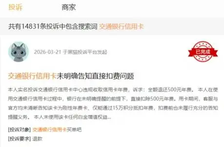 此外,在黑猫投诉等平台上,有关交通银行信用卡、贷款等业务的消费者投诉高达14831条。大量消费者投诉该行信用卡存在乱扣费、收取高额利息、威胁骚扰等现象。