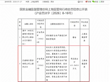 进入2026年,交通银行上海市分行因涉及向关系人发放信用贷款、违规对个别贷款品种部分免息等违规行为,被上海金融监管局罚款611.86951万元。
