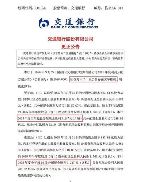 而交通银行2025年净利润只有956.22亿元,相当于错误的分红总额超过了交通银行全年净利润的3倍。
