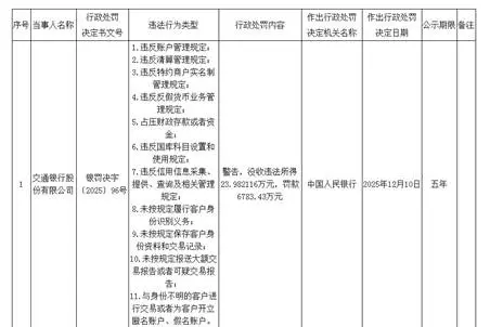 以交通银行为例,2025年12月,该行被中国人民银行开出了一张千万级别的罚单。罚单信息显示,其因存在违反账户管理规定、违反清算管理规定、未按规定履行客户身份识别义务、与身份不明的客户进行交易或者为客户开立匿名账户等11项违法行为,被收违法所得23.982116万元,并处罚款6783.43万元,合计6807.41万元。