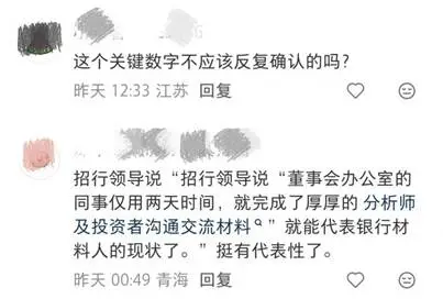 在小红书平台,有网友质问“关键按数字不应该反复确认吗”,还有网友提到之前招商银行领导所说的“董事会办公室的同事仅用两天时间就完成可分析师及投资者沟通交流材料”,指出银行业相关材料的审核现状。