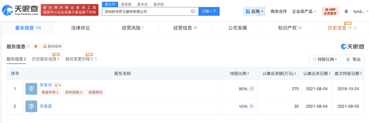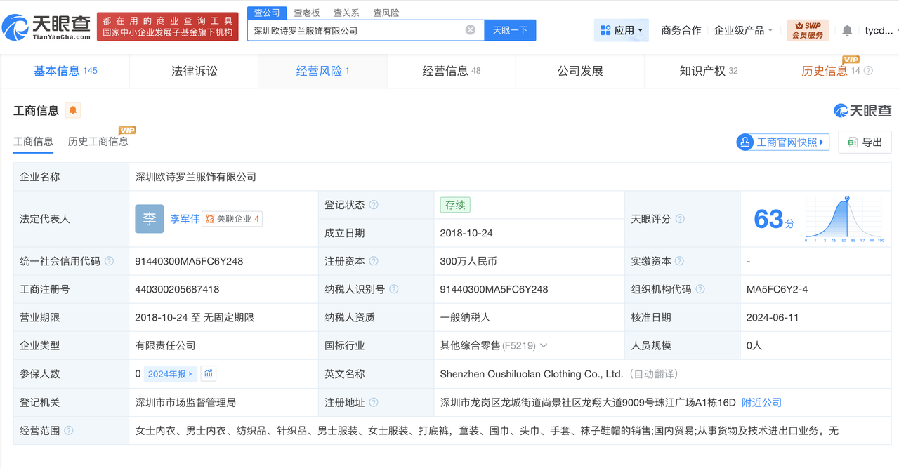 天眼查工商信息显示,遭315晚会曝光的深圳欧诗罗兰服饰有限公司成立于2018年10月,法定代表人为李军伟,注册资本300万人民币,经营范围包括女士内衣、男士内衣、纺织品、针织品等。股东信息显示,该公司由李军伟、李美霞共同持股。风险信息显示,2025年3月,该公司因通过登记的住所或经营场所无法联系被列入经营异常名录。