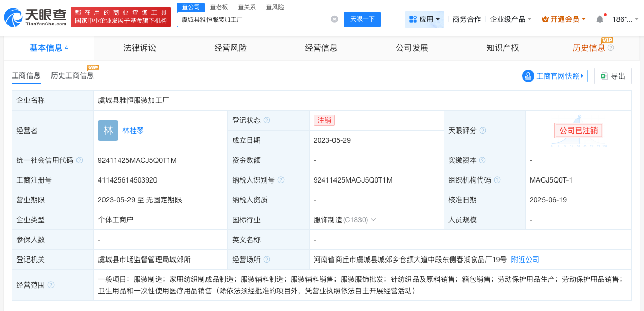 另一家遭315晚会曝光的虞城县雅恒服装加工厂成立于2023年5月,经营者为林桂琴,企业类型为个体工商户,经营范围包括服装制造、家用纺织制成品制造、卫生用品和一次性使用医疗用品销售等。目前该企业已注销。