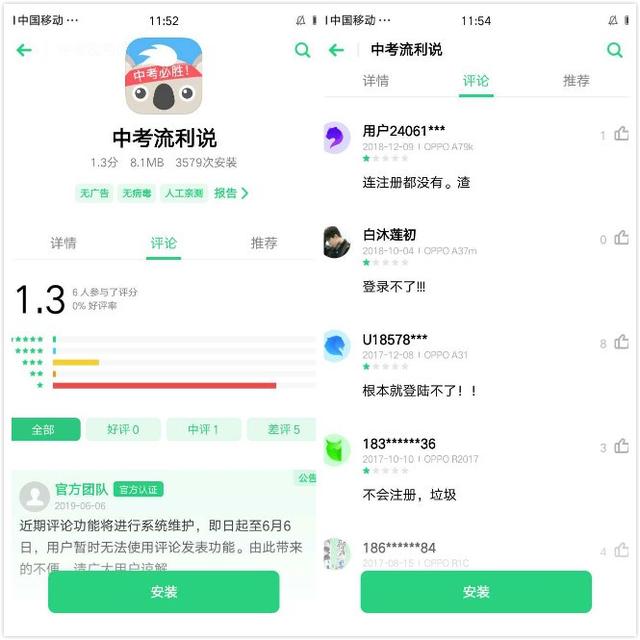 事实上,流利说也推出了针对K12的“中考流利说”,在中考竞争极为激烈的今天,针对为教育付费意愿非常强的K12群体,可以说是切入点非常好。但是各大应用商店的评分只有两分不到,并且用户评价也不太乐观。