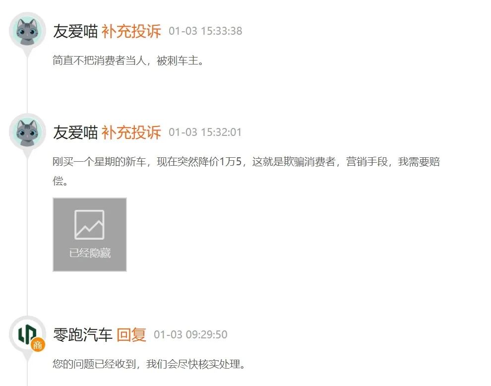 更是有用户刚下定还没提车,就遭遇了此次降价政策。该用户发帖称,他在零跑线下门店刚交了5000元定金,现在厂家就宣布优惠1.5万元。向门店店长寻求说法后,该店长称要1月下定的新用户才能享受优惠,退了重新订不算新用户。