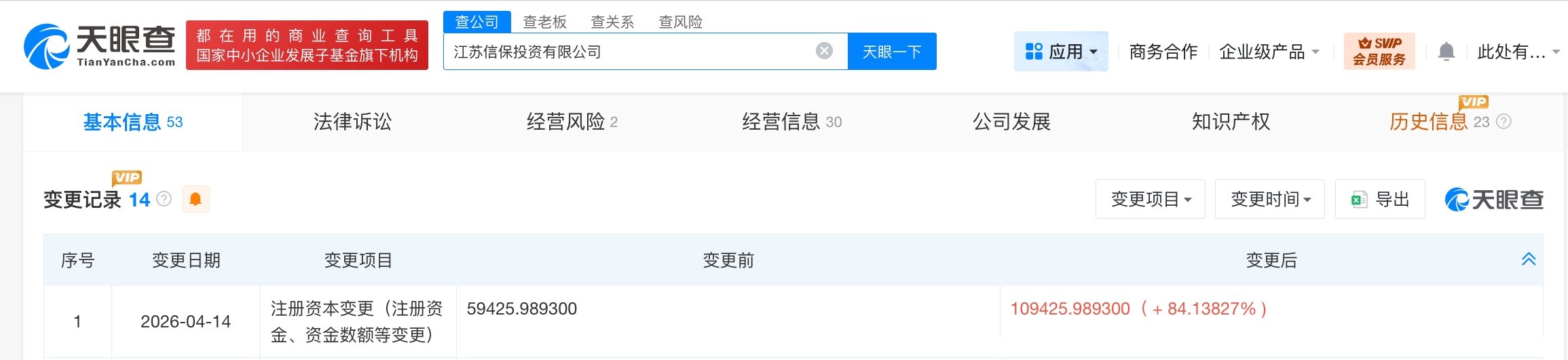 天眼查App显示,近日,江苏信保投资有限公司发生工商变更,注册资本由约5.9亿人民币增至约10.9亿人民币,增幅约84%。