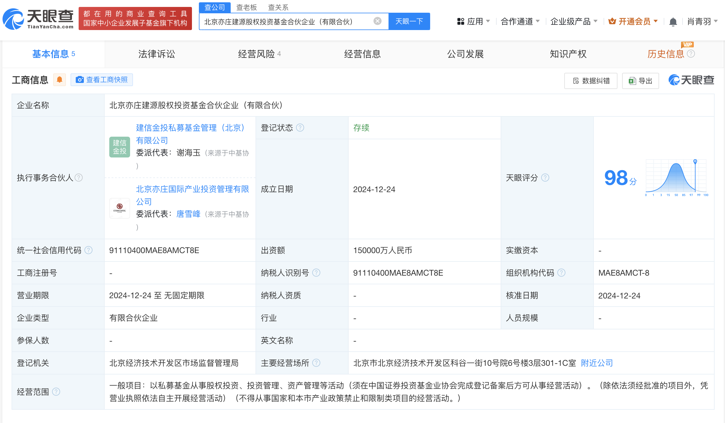 天眼查App显示,近日,北京亦庄建源股权投资基金合伙企业(有限合伙)成立,执行事务合伙人为建信金投私募基金管理(北京)有限公司、北京亦庄国际产业投资管理有限公司,出资额15亿人民币,经营范围为以私募基金从事股权投资、投资管理、资产管理等活动。合伙人信息显示,该基金由北京亦庄国际投资发展有限公司及其旗下北京亦庄国际产业投资管理有限公司,建信金融资产投资有限公司及其旗下建信金投私募基金管理(北京)有限公司共同出资。