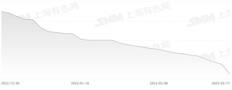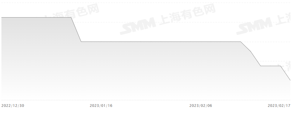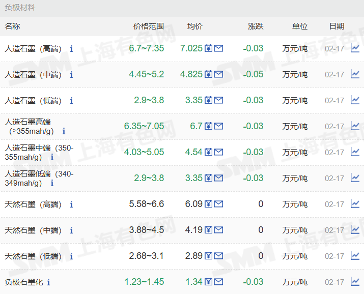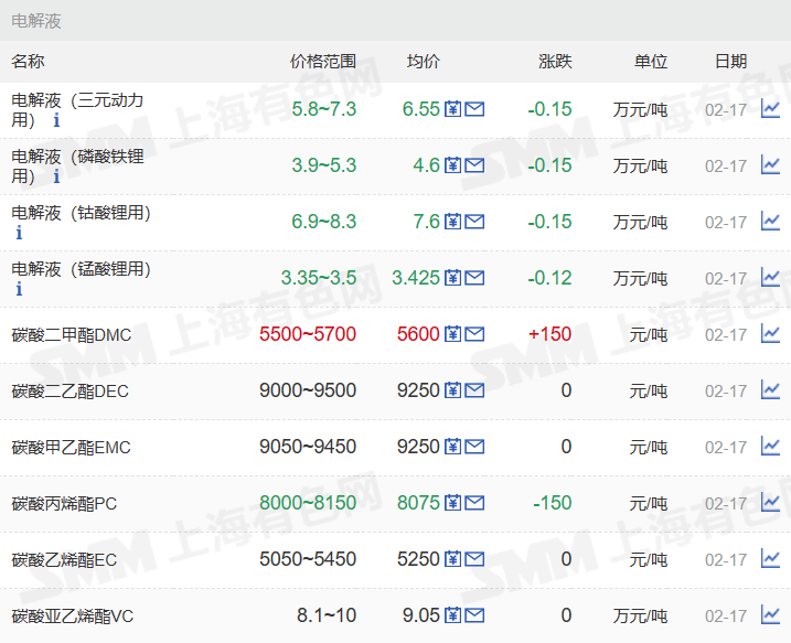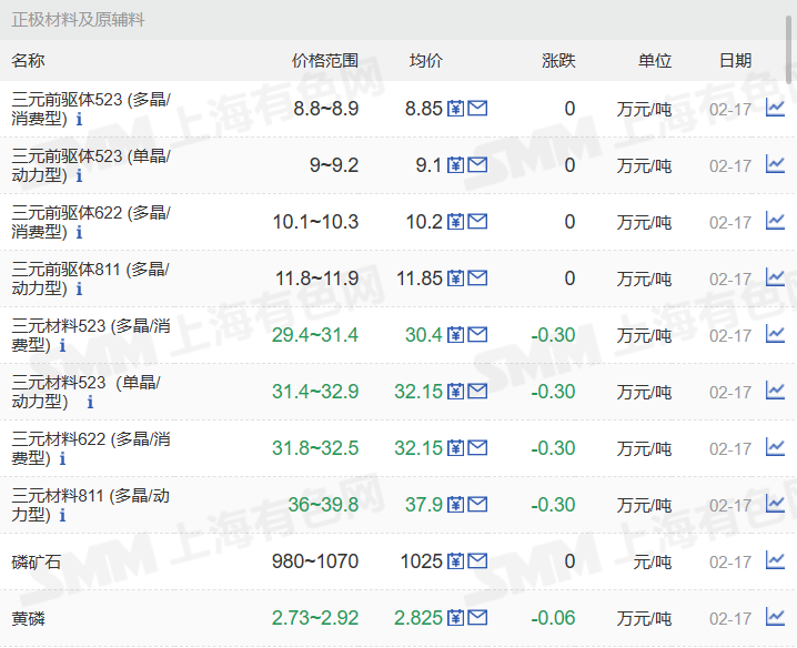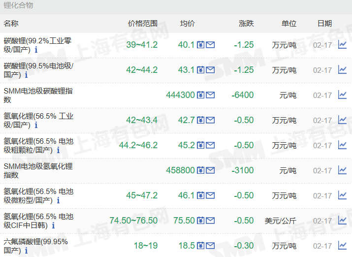 根据上海有色网数据,截至2月17日,电池级碳酸锂均价43.1万元/吨,工业零级碳酸锂均价40.1万元/吨;电池级氢氧化锂(56.5%国产粗颗粒)均价45.2万元/吨,工业级氢氧化锂均价42.7万元/吨。三元材料方面,523多晶、523单晶、622多晶、811多晶均价分别报每吨30.4,32.15,32.15,37.9万元。