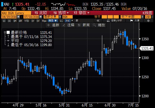 欧洲交易时段,因土耳其军事政变失败,导致黄金的避险需求降温,从而致使金价承压。黄金价格在低位震荡后于晚间试图反弹,但反弹未果。此前盘中一度深跌逾9美元/盎司。8月COMEX黄金期货价格现报1327.70美元/盎司,跌约5.2美元/盎司,跌幅0.42%,日内盘中低位1323.50美元/盎司。COMEX白银期货价格现报20.04美元/盎司,跌幅0.60%,至此日内低位19.77美元/盎司,日内高位20.29美元/盎司。
