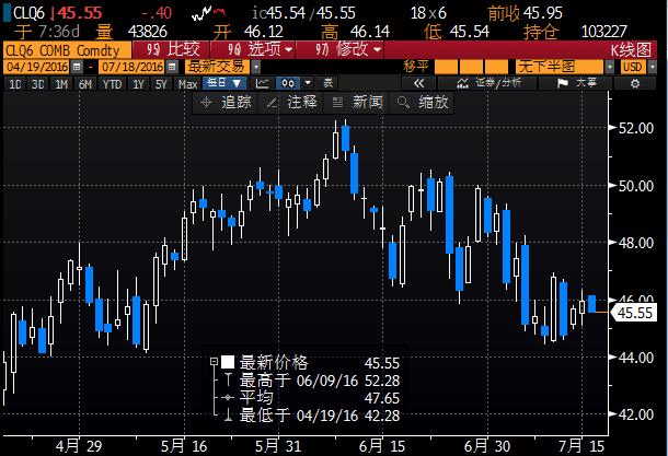 美国WTI原油期货价格跌破45美元/桶关口,9月布伦特原油期货价格现报46.92美元/桶,土耳其军事政变的失败致使金价的避险需求下降。