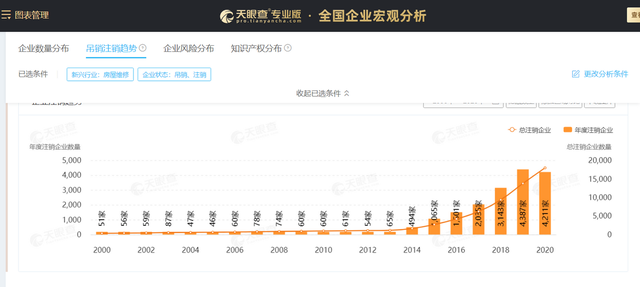 但是据天眼查专业版APP数据显示,互联网家装企业注销量反而不断攀升,在2019年达到4387家,在2020年也只是出现小幅回落。