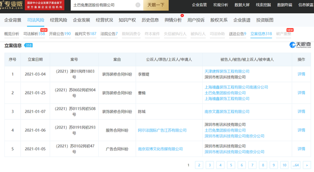 据天眼查专业版APP数据显示,土巴兔的立案信息高达318起,其中有大量装饰装修合同纠纷。