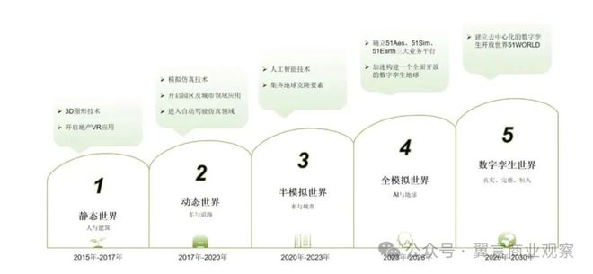 51WORLD宣称其已迈过“静态世界”、“动态世界”、“半模拟世界”三大阶段,集齐了地球克隆最基本的要素——“人与建筑”、“车与道路”、“水与城市”,并全面进入第四阶段(全模拟世界)