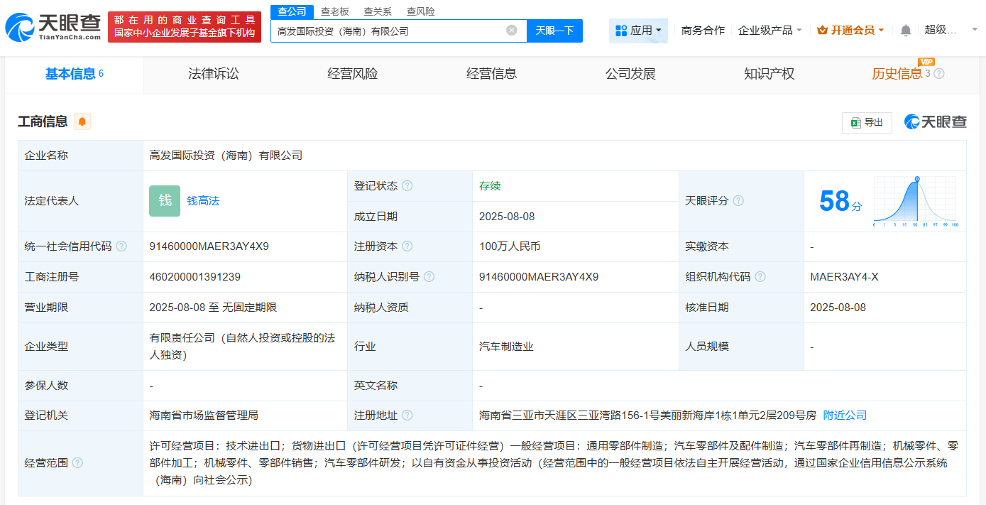 天眼查App显示,近日,高发国际投资(海南)有限公司成立,法定代表人为钱高法,注册资本100万人民币,经营范围包括通用零部件制造、汽车零部件及配件制造、汽车零部件再制造等。