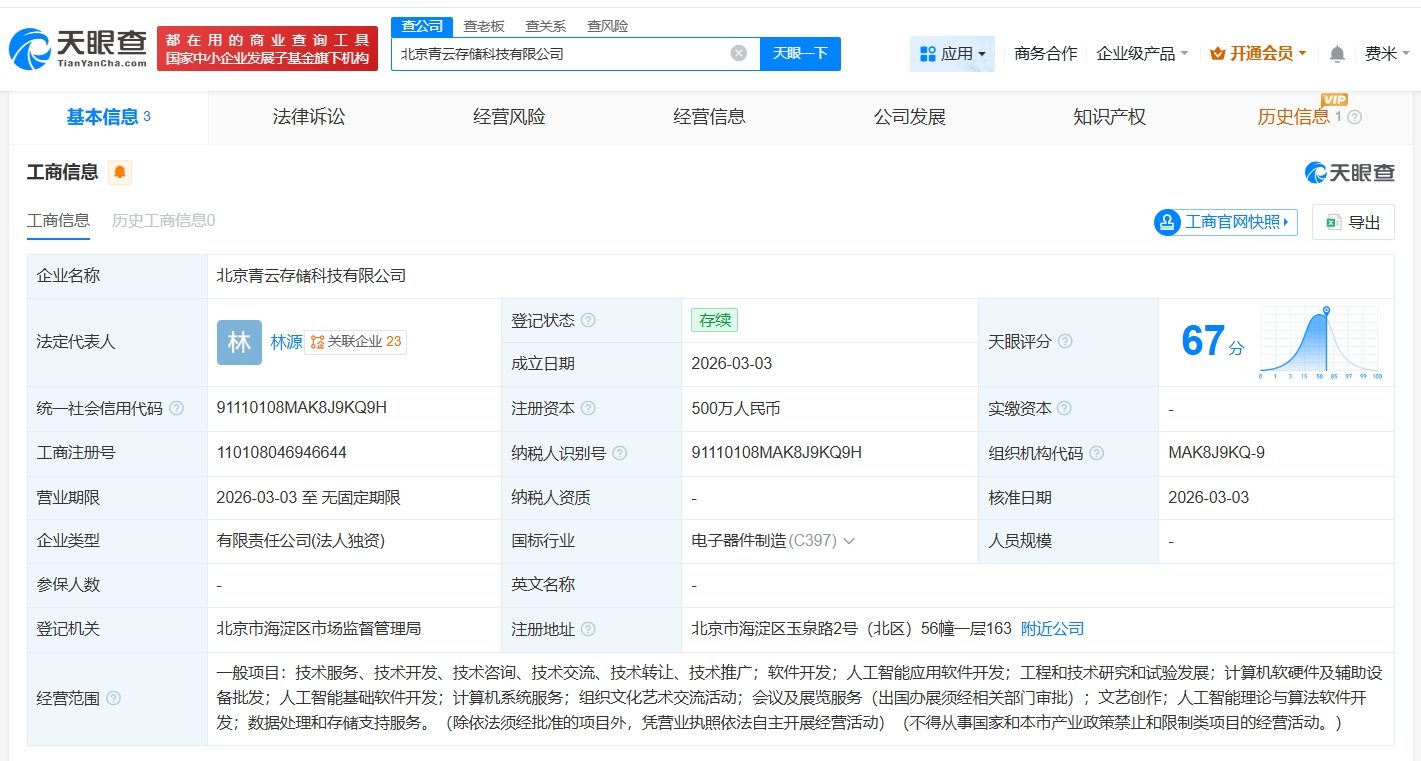 天眼查App显示,近日,北京青云存储科技有限公司成立,法定代表人为林源,注册资本500万人民币,经营范围包括人工智能应用软件开发、人工智能基础软件开发、数据处理和存储支持服务等。