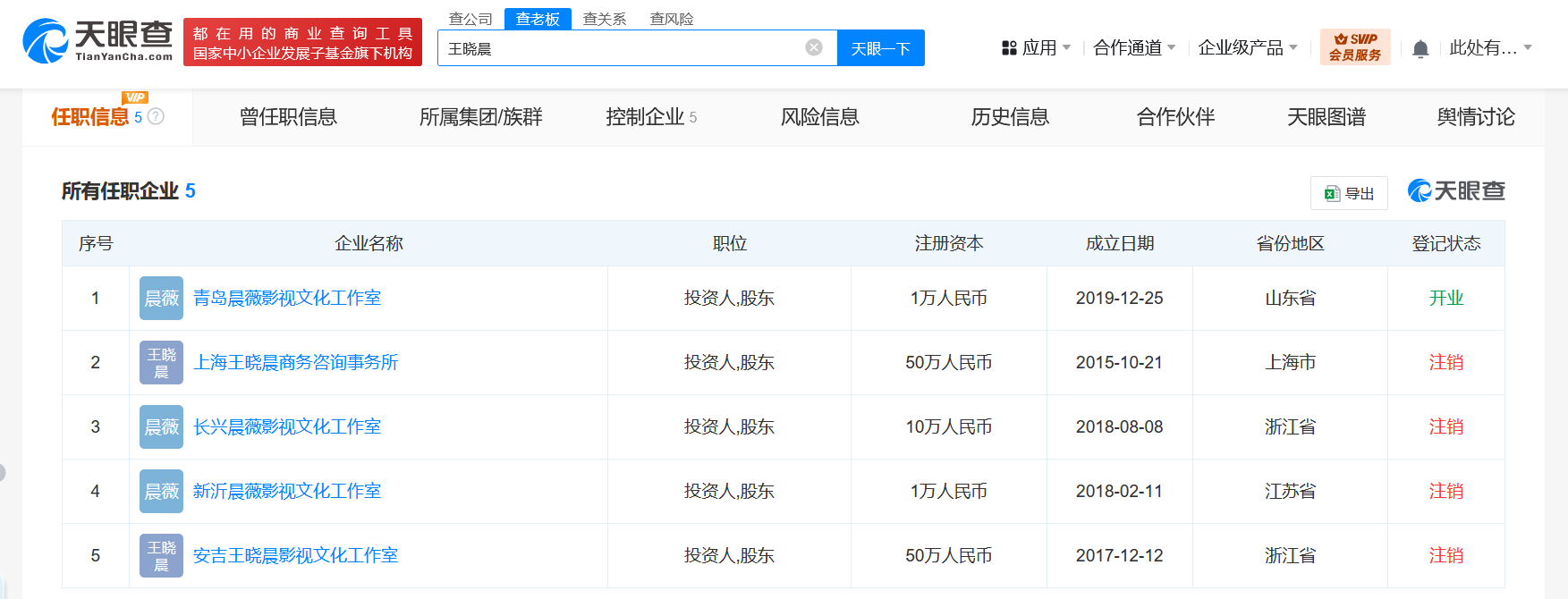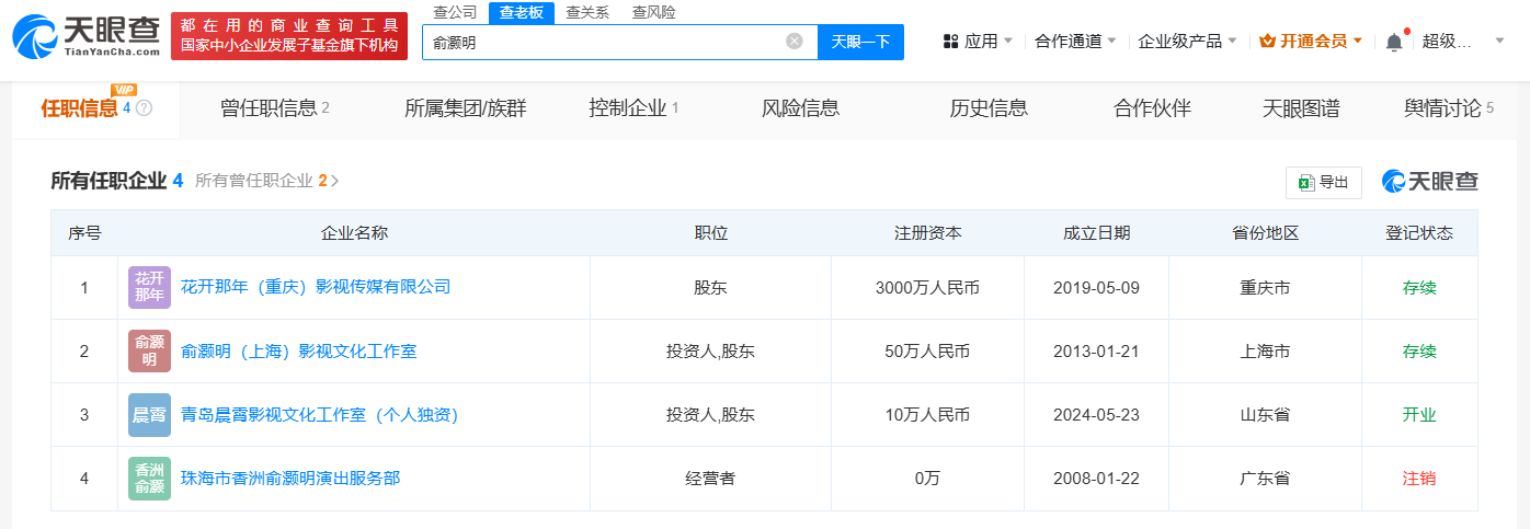 天眼查App显示,王晓晨名下关联5家企业,仅青岛晨薇影视文化工作室为存续状态,该工作室成立于2019年12月,出资额1万人民币,经营范围含文艺创作与表演,影视节目制作、发行,录音制作,文化娱乐经纪人,策划创意服务等,为王晓晨个人独资企业。俞灏明名下关联4家企业,其中3家为存续状态,包括俞灏明(上海)影视文化工作室、青岛晨霄影视文化工作室(个人独资)、花开那年(重庆)影视传媒有限公司。公开信息显示,王晓晨出生于山东青岛。