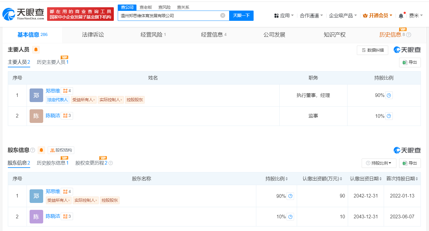 该公司成立于2022年1月,法定代表人为郑思维,注册资本100万人民币,经营范围包括体育赛事策划、体育用品及器材批发、体育竞赛组织等,由郑思维、陈晓洁共同持股。