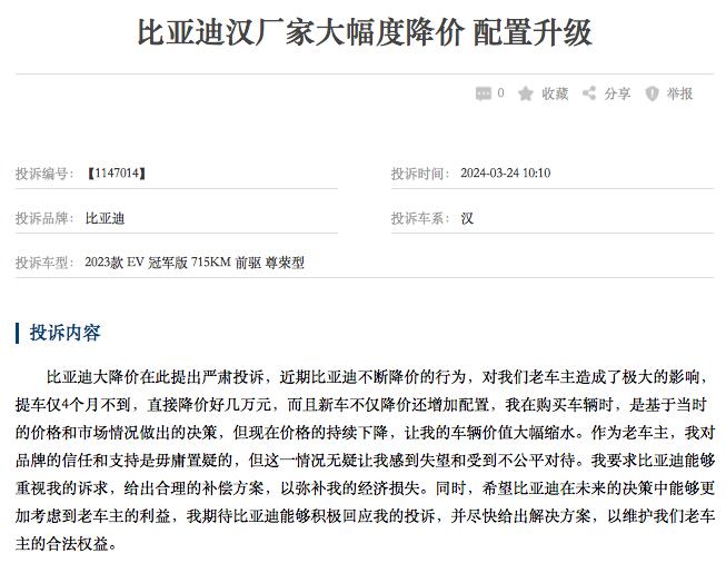 一名比亚迪汉 2023 款 EV 冠军版 715KM 前驱尊荣型车主投诉称:" 近期比亚迪不断降价的行为,对我们老车主造车成了极大的影响,提车仅 4 个月不到,直接降质价好几万元,而且新车不仅降价还增加配置,网我在购买车辆时,是基于当时的价格和市场情况做出的决策,但现在价格的持续下降,让我的车辆价值大幅缩水。作为老车主,我对品牌的信任和支持是毋庸置疑的,但这一情况无疑让我感到失望和受到不公平对待。我要求比亚迪能够重视我的诉求,给出合理的补偿方案,以弥补我的经济损失。同时,希望比亚迪在未来的决策中能够更加考虑到老车主的利益,我期待比亚迪能够积极回应我的投诉,并尽快给出解决方案,以维护我们老车主的合法权益。" 另外,也有多名比亚迪车主诉求:希望比亚迪补差价。