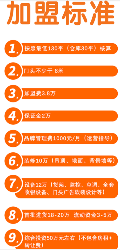 赛道竞争激烈,作为加盟商,加盟吖嘀吖嘀是否有利可图?江湖老刘在吖嘀吖嘀官网查到其加盟标准,按照最低130平(仓库30平)核算,门头不少于 8米,加盟费3.8万, 保证金2万, 品牌管理费1000元/月(运营指导) ,装修10万(吊顶、地面、背景墙等) ,设备12万(货架、监控、空调、全套收银设备、门头广告软装设计等),首批进货18-20万 ,流动资金3-5万, 综合投资50万元左右(不包含房租+转让费)。