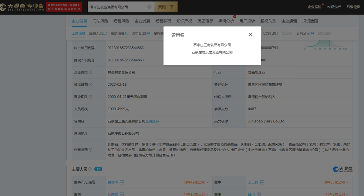 据天眼查APP显示,君乐宝乳业集团有限公司的曾用名正是石家庄三鹿乳品有限公司。